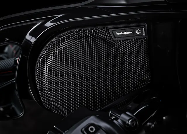 Powerful H-D® Audio Powered by Rockford Fosgate™-Stage II system built seamlessly into the fairing and saddlebag speaker lids deliver a robust, surround-sound experience.