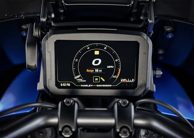 | Gauges | 6.8 inch viewable area TFT display with speedometer, gear, odometer, fuel level, clock, trip, ambient temp, low temp alert, side stand down alert, TIP over alert, cruise, range and tachometer indication BT capable – phone pairing to access phone calls, music, navigation (H-D App ONLY) |