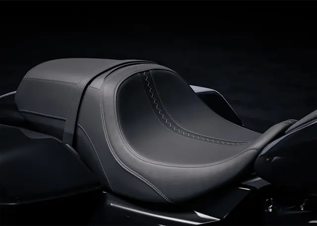 One-piece seat design creates a visual flow through the line of the bike while maintaining the highest standard for long-mile touring comfort.